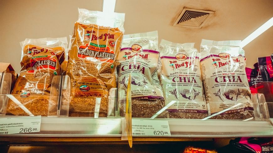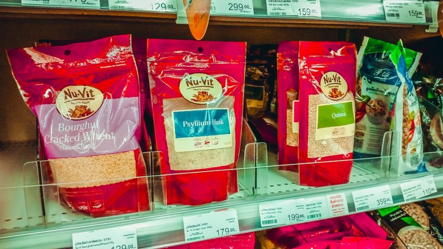 Также в супермаркете Central Festival есть всякие модные ништяки из американского зож: семена чиа (chia) и льна (flaxseed), киноа (quinoa), нут (chickpeas) и другие. В целях сохранения рассудка цены запрещено переводить в рубли. Та киноа, что на фотографии, самая недорогая. Американская же стоит 500-800 батов за упаковку.