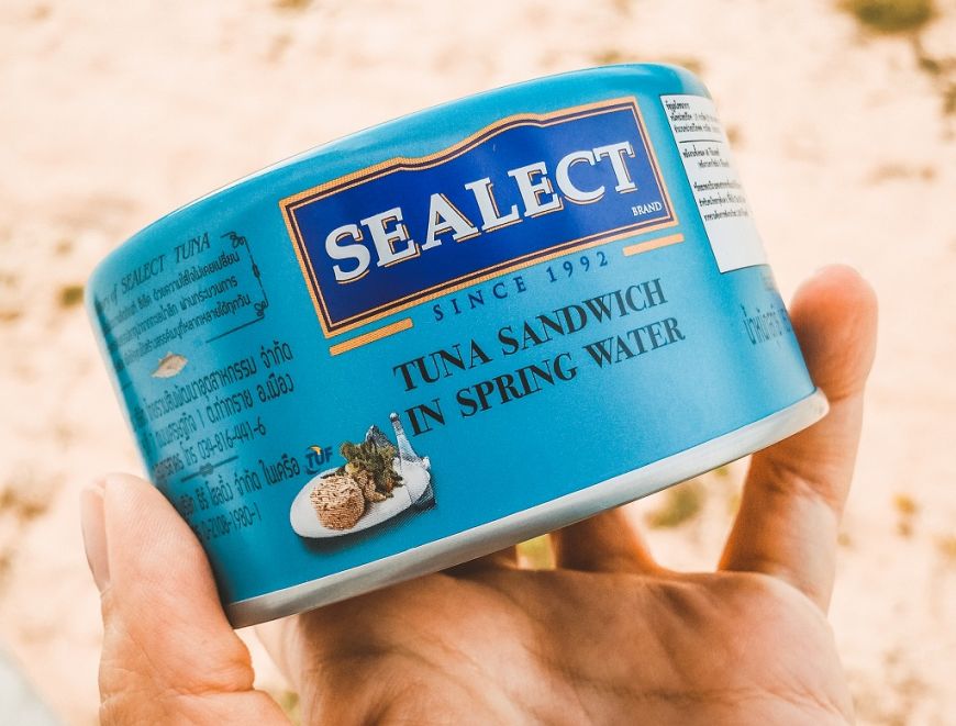 Недорогой консервированный тунец можно купить в любом супермаркете и даже магазинах шаговой доступности. Обратите внимание на упаковку: spring water – тунец в воде, brine – рассоле (очень соленый), oil – масле (очень жирный). Я всегда покупаю в собственном соку (т.е. в воде) для салатов.