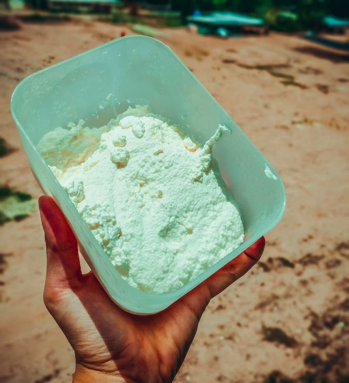 Творог можно купить либо в «Молочной реке» (их продукция есть в супермаркетах Friendship и Foodmart), но цена в 150 батов за 200 граммов как-то останавливает, либо с рук (в обоих случаях жирность продукта остается неизвестной). Я делаю творог сама, но редко, поскольку выход продукта получается небольшим, если делать с обезжиренного молока. Если брать цельное молоко, то творога получается больше, но его жирность почти что 20%. В теплое молоко я добавляю пару ложек «Yolida» (что на фотографии сверху) и оставляю на ночь в теплом месте (в условиях Таиланда, в любом месте). На следующий день готов кефир, вкусный, густой и с легкой кислинкой. Кефир нужно нагреть, но не доводить до кипения. Начнет отделяться сыворотка. Сыворотку отцедить. В результате получится очень вкусный творог. На фотографии снизу свежеприготовленный творог (из 1,2 литра молока 1,5% жирности получилось около 340гр творога 5% жирности).